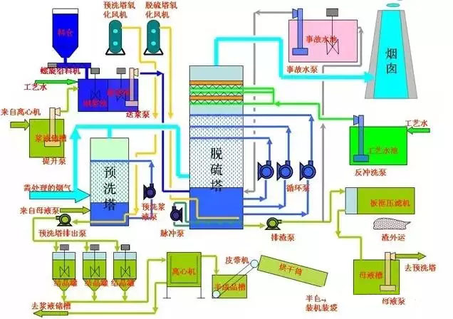 石灰石(石灰)石膏脫硫系統包括煙氣換熱系統、吸收塔脫硫系統、脫硫漿液制備系統、亞硫酸鈣氧化系統、石膏脫水系統等幾部分;該工藝是目前世界上最成熟應用最廣泛的技術。