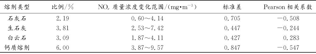 某鋼廠1號燒結機中使用的熔劑主要有石灰石、生石灰、白云石,按照熔劑的主要成分可以分為鈣質熔劑與鎂質熔劑。表2為該鋼廠的各種熔劑的使用比例與燒結煙氣中NOx質量濃度的相關性分析結果。