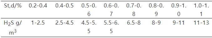 焦?fàn)t爐體竄漏會導(dǎo)致炭化室荒煤氣進(jìn)入燃燒室,荒煤氣燃燒生成SO2。荒煤氣中H2S含量主要取決于裝爐煤的全硫含量,煤中約15-35%硫轉(zhuǎn)入到荒煤氣中,其中95%以上H2S形式存在,荒煤氣中H2S含量與裝爐煤全硫含量關(guān)系見表2[7]。為便于計算荒煤氣中硫化物以H2S計,含量為5500-13000mg/m3,噸干煤煤氣產(chǎn)率320Nm3,若假設(shè)竄漏率1%,則竄漏荒煤氣中H2S燃燒生成的SO2約為50-120 mg/m3,遠(yuǎn)超過限制排放標(biāo)準(zhǔn)。